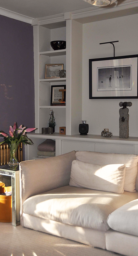 The main constraints with the budget were predominantly the scale of the room, this room is 5.5m x 6.5m with a ceiling height of 3.2m so we needed a lot of everything. The joinery was designed to house, our clients own items, photo albums, old books, DVD’s, charging points, media centre and with a ceiling height of 3.7m we decided to take the joinery up to the ceiling to utilise this and give some grandness to the otherwise boxy room. But one thing we did was we made the base of the joinery 600mm deep which meant we’d gone from a possible large carpet order with a lot of waste to a smaller amount with no waste, this saved the client a lot of money which we put towards refurbishing the existing radiators and having them powder coated to our requirements.