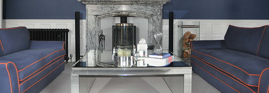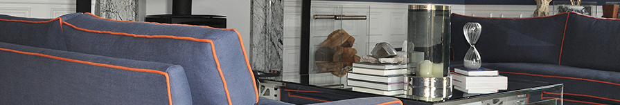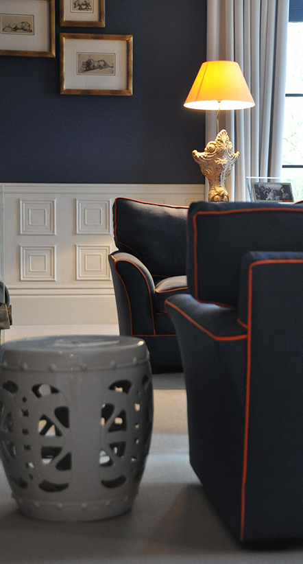 Our clients only note was “we fancy some orange; how do we do incorporate this without it being OTT?” As you can imagine we were so excited, orange is such a strong and emotive colour and we looked at suitable colours to compliment the orange. With this in mind we opted for orange as the accent colour and the base of the room being a beautiful deep navy and a subtle grey. Both great backdrops for the orange to work with we then brought the orange in with chunky curtain poles, piping on the sofa and upholstery fabric for the two reading chairs having a splash of orange running through it.