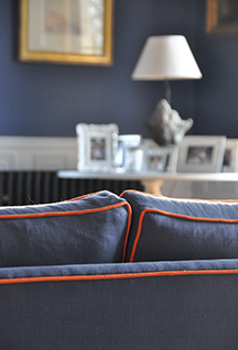 The navy and grey as a backdrop is super but not only did it work with the orange it made the room cosier and by putting the navy above the panelling the walls came in making this enormous room much more comfortable to sit in. This room it has to be stressed is of lovely Georgian proportions, 9m x 6.5m with a ceiling height of 3.8m.