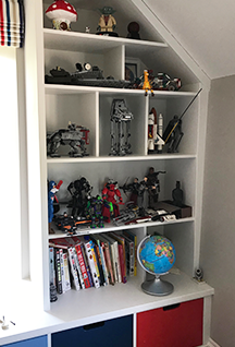 Both the children’s rooms required joinery, one needed serious Lego display at the forefront of the design and the other so many soft toys needed to be housed or hidden away. The joinery has been designed predominantly around solving the lack of storage, we’ve been practical but also conscious that we need to add style too. We’ve added lighting to light treasured teddys and Lego sculptures and we’ve incorporated cupboards and drawers where possible along with seating.